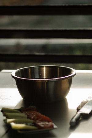 Aluminum bowl with water and ice cube on the dining table in the restaurant, Thai style