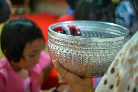 To make merit by offering food to monk ceremony in Thai wedding tradition.Selective focus on alms bowl.
