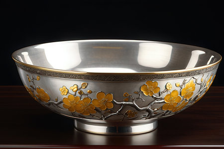 Metal bowl with gold pattern on wooden table. Isolated on black background
