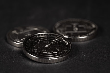 Silver coins on dark background. Ukrainian 10 hryvnias coins. Money and finances. Ukrainian coins