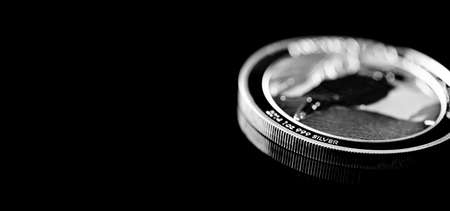 Macro Close up of Silver Bullion Coin on a black mirror background