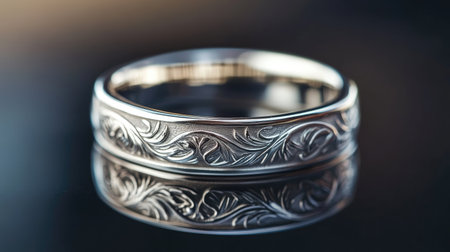 A stunning closeup of a silver ring featuring an intricate leaf pattern, showcasing exceptional craftsmanship and reflective characteristics, ideal for fashion and weddings.