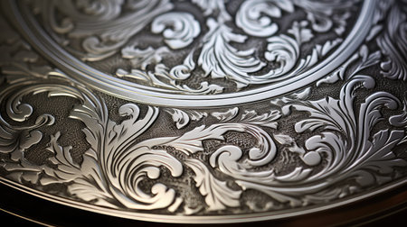 A detailed close-up view of intricate floral scrollwork engraving on a silver metal surface. The craftsmanship highlights the artistic patterns and texture of the etched design, creating a sense of luxury and antique elegance.