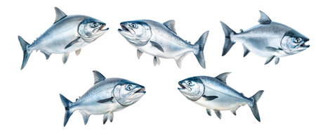 Set of Raw salmon fish with detailed fins and scales, isolated on white transparent background, concept of marine life.
