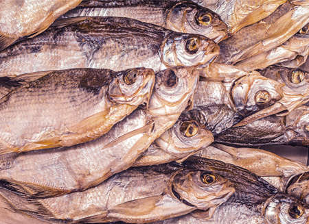 Fish series in the bazaar. A group of dried fish ram lies on the counter in the market