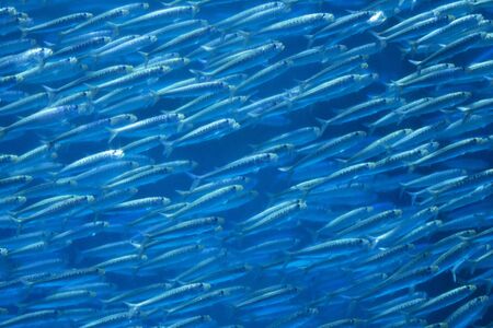 A school of anchovies swimming in the deep blue sea of the Pacific Ocean, Anchovies are commonly used as bait fish for fishermen.