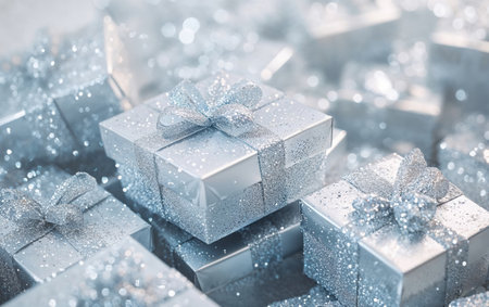 Silver gift boxes with sparkling glitter are making a big pile, ideal concept for Christmas or birthday present