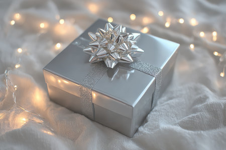 A silver gift box with a snowflake-shaped bow rests on soft white fabric, illuminated by warm fairy lights, evoking a festive and inviting holiday ambiance