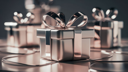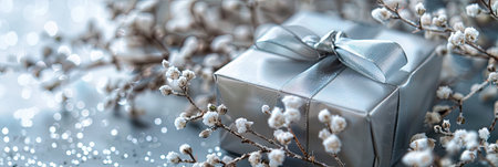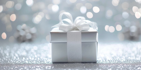 A beautiful white gift box tied with a silver ribbon set against a light background, ideal for showcasing gifts for any celebration or special occasion, evoking elegance and joy.