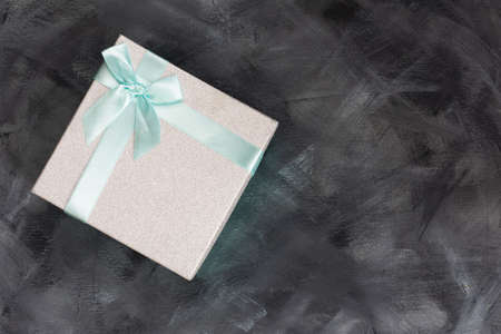 Blue gift box top view. Dark grey design background. Space for text. Gift in a box. The layout of the cards. Calm cold shades.
