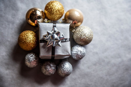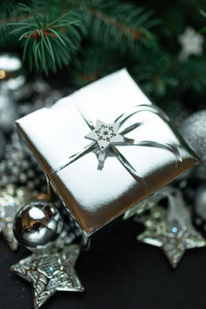 View of Christmas ornament and a silver wrapped gift box on a light background. Christmas gifts and decoration concept.