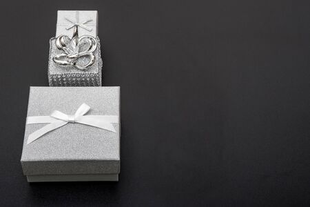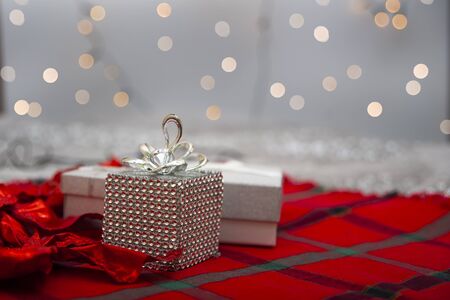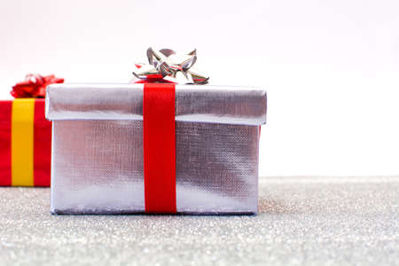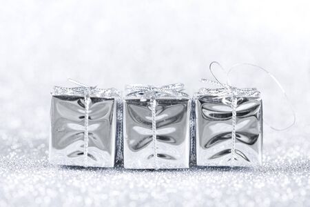 White present boxes on shiny silver background. Christmas and New Year decoration