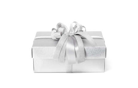 Gift box with silver ribbon on white background