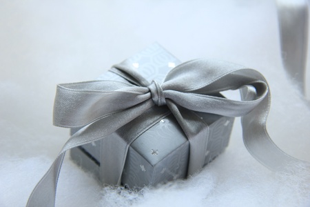 Luxury christmas gift in a silver box with a grey silver satin ribbon