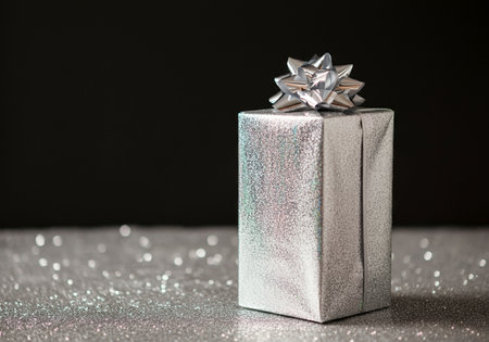 Square shape present wrapped in silver paper, decorated with silver shining bow on black background