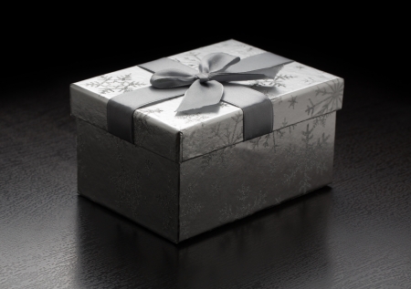 Shiny silver gift box on black background.