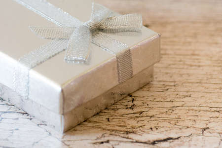 silver gift box on wooden rustic planks