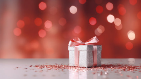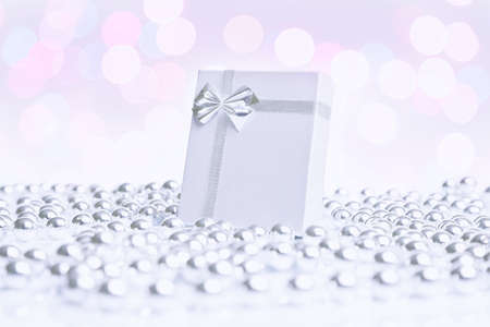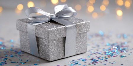 Silver gift box with silver ribbon and confetti on bokeh background
