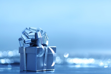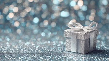 A small silver gift box with a white ribbon sits on a sparkly blue background. The scene is festive and perfect for celebrations, including birthdays and holidays.