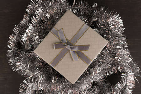 Gift box with silver tinsel on a dark background, top view.
