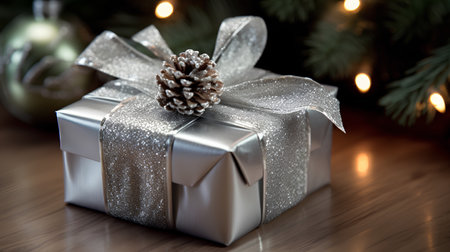 A sturdy cardboard gift box wrapped in shiny silver paper and adorned with a bright red ribbon, ideal for New Year and Christmas gifting, creating a festive atmosphere