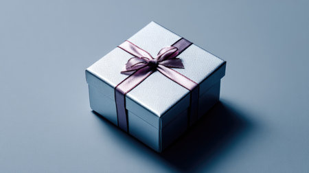 A beautifully wrapped silver gift box adorned with a purple ribbon, placed against a soft gray background, creating an elegant and minimalistic aesthetic perfect for any special occasion.
