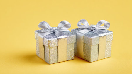 Two silver boxes with ribbons on top of a yellow background. The boxes are placed next to each other