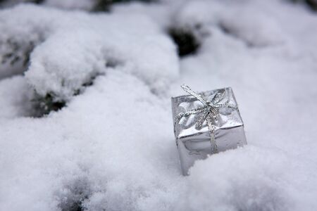 Silver christmas present on white snow.