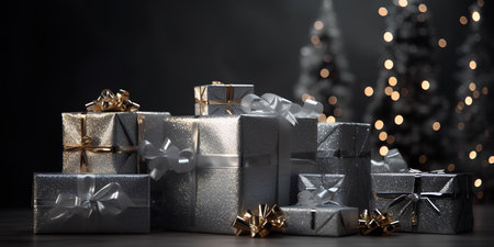 Christmas theme. Many gift boxes wrapped in silver colored paper with ribbons. Christmas tree on background. Dark background with bokeh