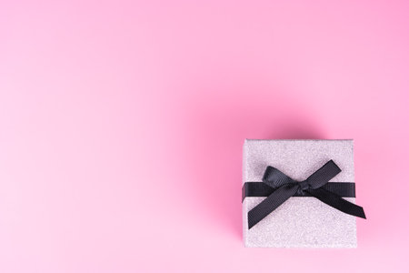 Small silver gift package with black bow, pink background, copy space