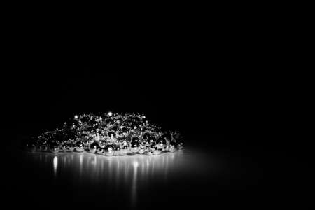 An enchanting close-up view of sparkling water droplets resting on a surface, enhanced by soft focus light reflections. Ideal for abstract art and design projects.
