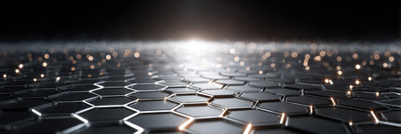 Reflective metallic hexagonal shapes create an intricate pattern, showing subtle lighting effects in a dark setting, evoking a sense of depth and modernity.