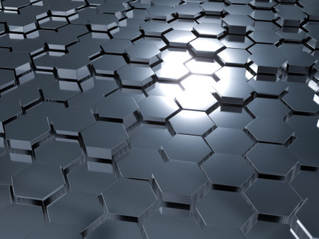A smooth metal surface with a repeating pattern of hexagonal tiles, each with a different shade of metallic sheen and glowing blue accents.