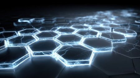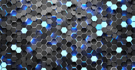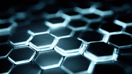 A modern digital concept of interlinked hexagons with glowing edges creates captivating visual effect. intricate design showcases blend of dark and luminous elements..