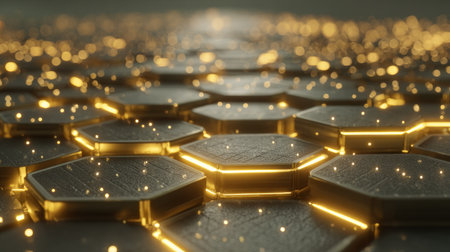 A close-up abstract image showcasing a pattern of black glossy hexagons with scattered golden glowing lights.