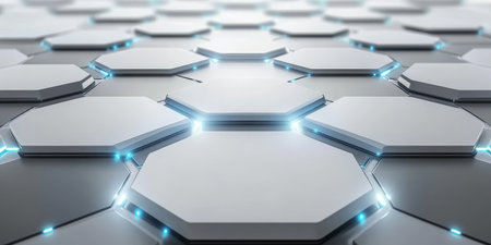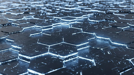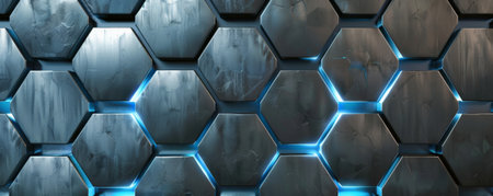 A close-up of a futuristic hexagonal surface with a metallic texture and glowing blue light emanating from the edges of each hexagon.