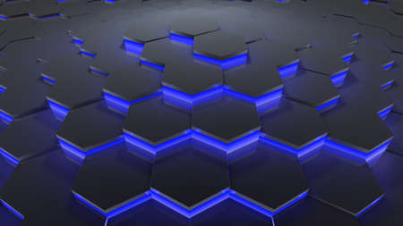 Black geometric hexagonal abstract background. Surface polygon pattern with blue glowing hexagons, honeycomb. Abstract blue self-luminous hexagons. Futuristic abstract background 3D Illustration