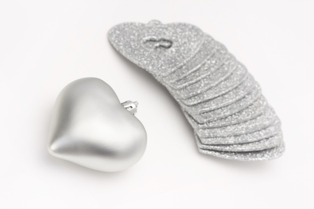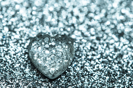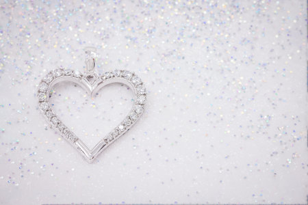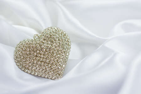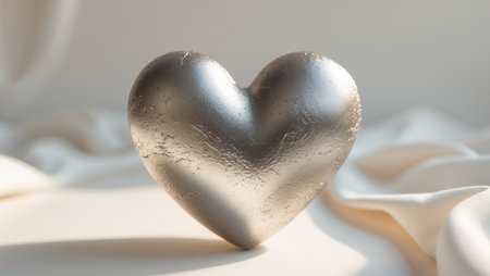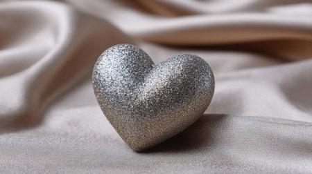 A glittery silver heart rests on smooth satin fabric, creating a beautiful and romantic scene. Ideal for themes of love, elegance, and celebration.