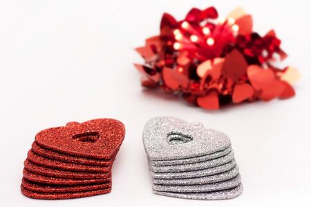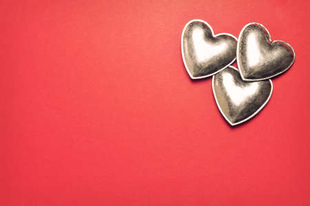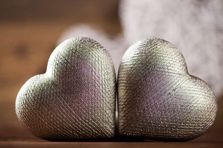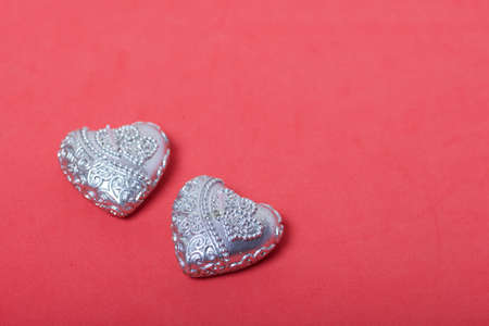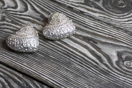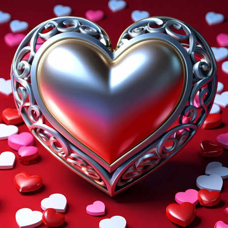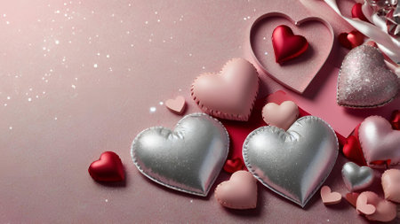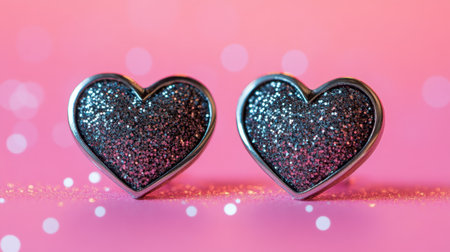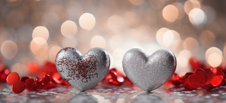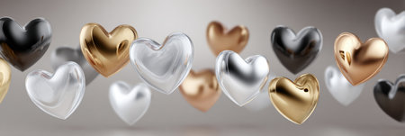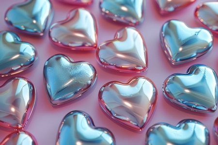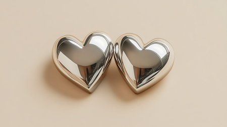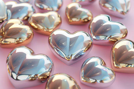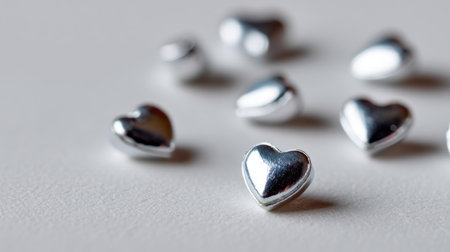 A captivating close-up of shiny heart-shaped metallic accents scattered on a smooth surface, perfect for romantic themes, creative projects, and modern design inspiration.