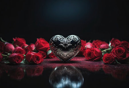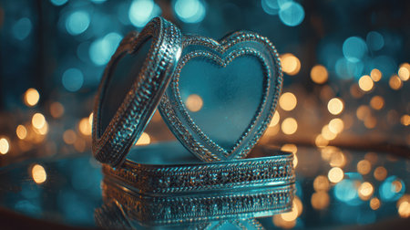 A heart-shaped metallic gift box is placed on a reflective surface, surrounded by soft glowing bokeh lights, enhancing the romantic atmosphere.