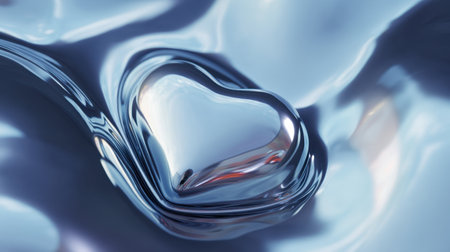 A heart shape reflects in a smooth liquid surface, surrounded by gentle waves and soft blue tones, creating an atmosphere of serenity and romance.