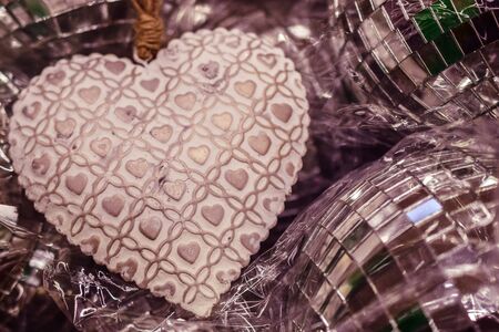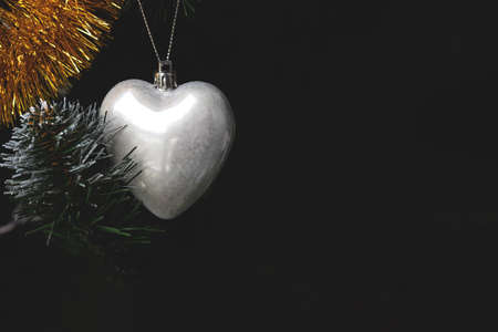 Silver white glossy heart and golden tinsel garland on artificial Christmas tree on dark black background. Banner concept with copy space. Holiday card with decorations for the New Year's Eve