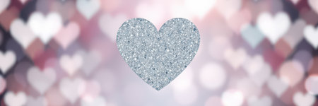Horizontal background, wedding, Valentine's day. Silver heart and bokeh. AI generative. Illustration in photorealistic style.