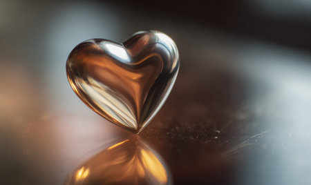A heart made of glass is sitting on a table. The reflection of the heart is visible in the glass