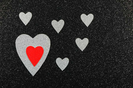 Red glitter hearts on black background. Selective focus. Valentine´s Day.