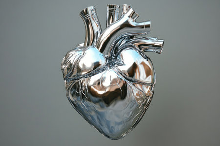 A chrome heart anatomy hovers mid-air, showing intricate details and a polished surface that reflects soft lighting, creating a modern look.