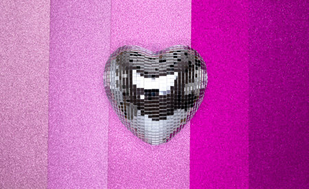 Disco heart on Monochrome pink glitter background. Minimalist holiday texture for Valentines