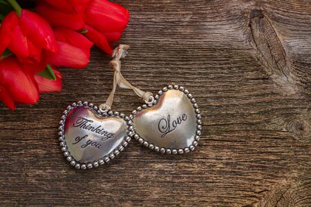 Gift boxes with heart shaped decor for St. Valentines Day celebration on dark rustic background