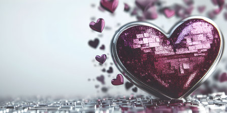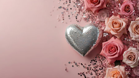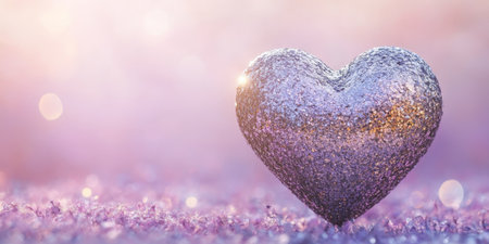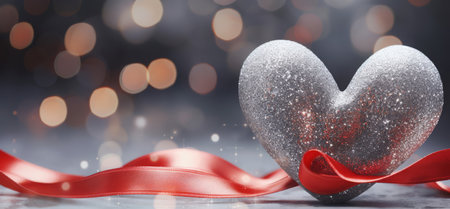 A beautiful shimmering silver heart sits at the center, surrounded by a soft glow of sparkling lights and glitter, creating a romantic and enchanting atmosphere perfect for celebrations of love