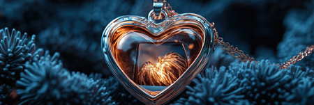 A reflective, metallic heart-shaped ornament sits prominently in the center of the image, surrounded by a soft glow of warm, twinkling lights. The background is dark, creating a striking contrast that accentuates the shine of the ornament and the gentle illumination of the lights. The overall atmosphere is one of warmth and elegance, evoking a sense of holiday cheer and romance.